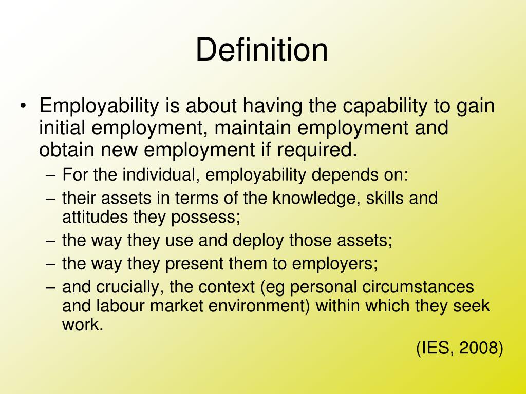 The definition of employability skills suggests that qualities like effective teamwork and excellent speaking skills help you get along with others—making a greater impact in the workplace. Employability is related to work and the ability to be employed, such as: Complex and involves a number of different areas that interlink. Employability skills are important from three different points of view.